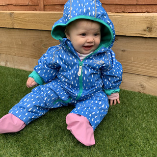 It’s age 6-12 months so it has growing room. It comes with fold over hands and detachable feet. The feet I didn’t find very useful because there were gaps created by attaching with only 2 poppers so I have been using her waterproof shoes as above. I’ve either tucked her trousers inside or worn over top of her trousers. This worked very well. And I’m very happy with the purchase even if at first I did think it was a little expensive.